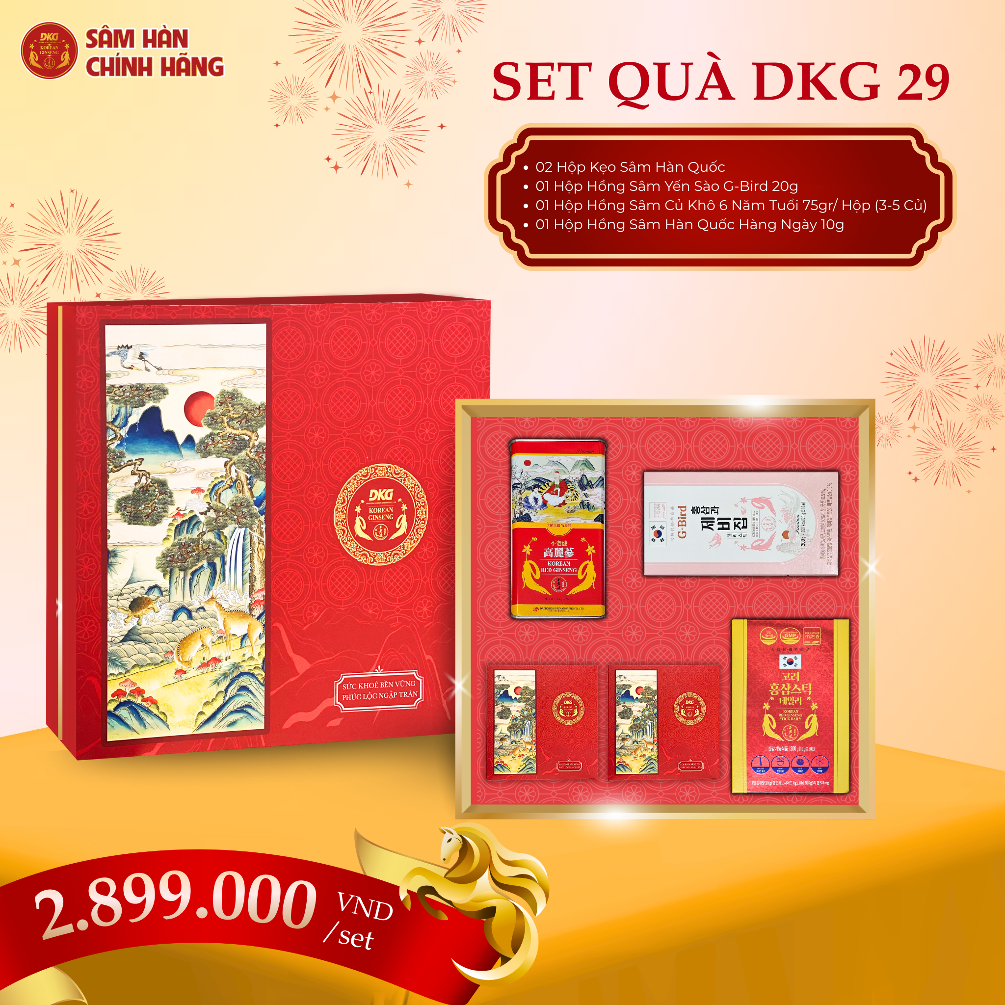 Set Quà Tết DKG.29 không chỉ đơn thuần là một hộp quà, mà còn là sự kết tinh của tấm lòng, lời chúc sức khỏe và niềm hi vọng cho một khởi đầu may mắn, hạnh phúc trong năm Bính Ngọ 2026. Hộp quà là biểu tượng của sự trân trọng – trường thọ – may mắn – thịnh vượng, giúp người tặng gửi gắm thông điệp tốt lành đến người nhận một cách trọn vẹn và tinh tế nhất.